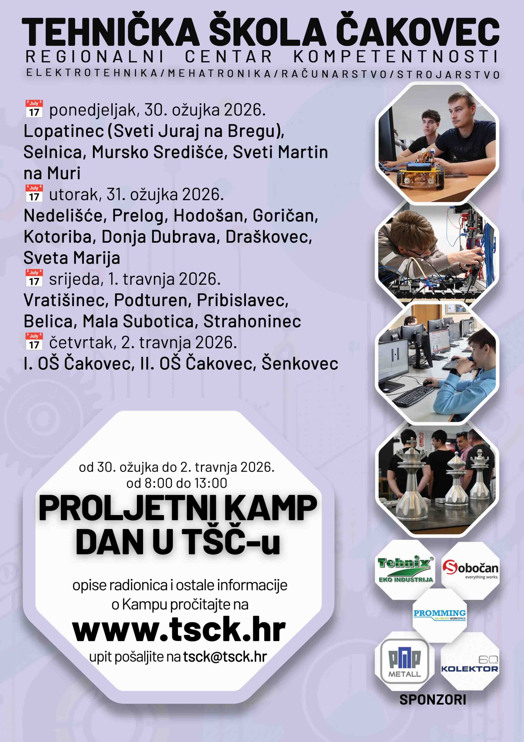 Vaš dan bit će podijeljen u četiri radionice, a svaka vas vodi u uzbudljiva područja strojarstva, elektrotehnike, mehatronike i računalstva. Detaljan raspored autobusnog prijevoza stručni suradnici vaše škole već imaju — oni će vas pravovremeno informirati.